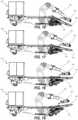 - FIG. 2 illustrates that theupper arm assembly128 includes arotatable gantry220 having therear end130 pivotally attached at theupper arm axis134 to the left and rightlower arms120. Therotatable gantry220 has a lateral guide222 at anextended end114. Theupper arm assembly128 includes anend arm226 proximally attached for lateral movement to the lateral guide222 of therotatable gantry220 and distally attached to themanipulator head136. Theend arm226 laterally translates to reach an increased lateral area. Thereby a lighter weight and moremaneuverable manipulator head136 can be employed.FIGs. 2-3 illustrate thetelescoping beam144 of thelift140 and the built-in jackingapparatus166. A nose tiltinghydraulic actuator225 is mounted between thetelescoping beam144 and a forward end of thefront portion142 of theconveyor system110. A drive belt motor227 is mounted to thetelescoping beam144 to extend and to retract thetelescoping beam144.