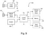 - Fig. 9 is a simplified block diagram of an examplewireless control device 900, which may be deployed as, for example, thesystem controller 110 of theload control system 100 shown inFig. 1. Thewireless control device 900 may comprise acontrol circuit 910, which may include one or more of a processor (e.g., a microprocessor), a microcontroller, a programmable logic device (PLD), a field programmable gate array (FPGA), an application specific integrated circuit (ASIC), or any suitable processing device. Thecontrol circuit 910 may perform signal coding, data processing, power control, input/output processing, and/or any other functionality that enables thewireless control device 900 to perform as described herein. Thewireless control device 900 may comprise anetwork communication circuit 912 that may be coupled to a network connector 914 (e.g., an Ethernet jack), which may be adapted to be connected to a wired digital communication link (e.g., an Ethernet communication link) for allowing thecontrol circuit 910 to communicate with network devices on a network. Thenetwork communication circuit 912 may be configured to be wirelessly connected to the network,e.g., using Wi-Fi technology to transmit and/or receive RF signals (e.g., the RF signals 106 shown inFig. 1).
