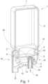 Die Halterung 24 umfasst ferner einen Befestigungsflansch 34, welcher die Kartuschenaufnahme 10 beim Einsetzen in die Halter formschlüssig und/oder kraftschlüssig umgreift. Der Befestigungsflansch 34 umfasst hierfür wenigstens zwei Klauen 37, welche die Kartuschenaufnahme 10 radial umgreifen. Die Halterung 24 weist zudem eine Auslösemechanik zur Betätigung des Befestigungsflansches 34 auf. Die Auslösemechanik umfasst beispielsweise einen manuell durch den Benutzer zu betätigen Handhebel an der Halterung 24, welcher bei seiner Betätigung um eine zu Längsachse der Kartusche 2 im Wesentlichen parallele Drehachse verschwenkbar ist. Der Handhebel ist über ein Übersetzungsgetriebe mit den Klauen 37 des Befestigungsflansches 34 derart gekoppelt, dass durch die Verschenkung des Handhebels die Klauen 37 aufeinander zu bewegt werden und die Kartuschenaufnahme 10 zwischen sich formschlüssig aufnehmen oder einklemmen.The