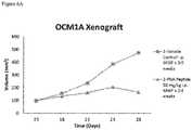 - Figure 6 shows data from xenograft mouse model studies employing OCM1A cells.Figure 6A shows 50% tumor volume regression after three 50mg/kg IP doses of PNA agent I-292-3 L2LP NHAc given ondays 5, 17, 20, and 22. Tumor shrinkage begins to increase more than a week following the last dose.Figure 6B shows,that treated mice exhibit no side effects as there was no weight loss or changes in daily activity over a the entire length of the treatment shown inFigure 6A.