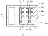 Figure 3 is a block diagram illustrating an example of another type of unmannedaerial vehicle 300 which could be used in thesystem 1 shown inFigure 1. In this example, in at least some of the unmanned aerial vehicles there is further stored in the memory 21 a plurality of sets ofconditions 301a-d for one or more payloads provided on said unmannedaerial vehicle 300, and wherein each set ofconditions 301a-d is assigned torespective flight plan 23a-d stored in memory 21 (or, in another embodiment, each set ofconditions 301a-d assigned to arespective command 7a-d stored in memory 21). In this embodiment theprocessor 25 is further configured to, retrieve from thememory 21 of that aerial vehicle 301 the set ofconditions 301a-d assigned to theflight plan 23a-d which that vehicle is about to follow, and to operate the one or more payloads on said unmannedaerial vehicle 300 so that they meet the conditions specified in the retrieved set ofconditions 301a-d. For example, in response to thesingle controller 5 broadcasts athird command 7c theprocessor 25 will retrieve from thememory 21 theflight plan 23c associated with thethird command 7c; theprocessor 25 will then check to ensure that thevehicle 300 can travel the flight path specified in the retrievedflight plan 23c without colliding with an object and will also check to ensure that the vehicle 301 has sufficient resources to travel the retrievedflight plan 23c (for this example it is assumed that theprocessor 25 determines that there is no risk of collision with an object and that the vehicle has sufficient resources); theprocessor 25 will also retrieve from thememory 21 the set ofconditions 301c which are associated with the retrievedflight plan 23c (or, in another embodiment, retrieve from thememory 21 the set ofconditions 301c which are associated, in thememory 21 with the retrievedthird command 7c). Theprocessor 25 then configures the payload(s) provided on thevehicle 3 so that they meet the conditions specified in the retrieved set ofconditions 301c; configuring the payload(s) provided on thevehicle 3 so that they meet the conditions specified in the retrieved set ofconditions 301c may require theprocessor 25 to operate the payloads in a specific manner during the execution of the retrievedflight path 23c.