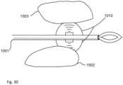 - In embodiments, guiderail type sensors may contact the surface of the inferior and middle turbinates directly to aid with positioning of the ablation element in the region of interest. The guiderails are comprised of a spring-based or otherwise expandable/compressible rod topped by a sphere or another suitable structure that can glide smoothly along tissues while maintaining contact. As shown inFig. 32A, when deployedguiderails 1008 emanate from the superior and inferior aspects of a probe and maintain contact with the turbinates as the probe traverses the nasal cavity in the region of the middle meatus. As an aspect of the probe becomes closer to the corresponding turbinate, force is exerted on the corresponding sphere and the corresponding guiderail is compressed, as shown inFig. 32B. In embodiment, instead of being compressed the guiderail may be bent or shifted to a more acute angle. As an aspect of the probe moves away from the turbinate, or the probe traverses past the posterior boundary of a turbinate, the corresponding guiderail expands in length or is straightened and/or angled more normal to the probe surface. Sensors in the device measure guiderail position and can determine the presence of the turbinates, and in embodiments the distance to the turbinates. This information is used to guide the probe to the desired region for ablation. In embodiments, the guiderails may be collapsible into the body of the probe shaft so as not to increase the width of the shaft when not in use. This may allow the probe to maintain optimal maneuverability.Fig. 32C shows an embodiment including collapsible guiderails where aguiderail 1008 containing a spring-basedbody 1009 may collapse into a recessed region of theprobe shaft 1007.