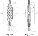 - In each case, thecompression pipe 2 has four movable fins 2.2. The width of the fins 2.2 is chosen to be large enough to engage with the struts of the compressible housing of thecatheter device 1. I.e., for a higher density of struts, thinner fins can be provided. When the density of struts is low in all parts of the housing, broader fins are provided, sometimes embodiments with three fins instead of four fins are chosen for a low density of struts.