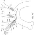 - Thesystem 60 is advanced into the subject's right radial artery through an incision in the right arm, or alternately through the right brachial artery. For example, thesystem 60 may be advanced through the same incision as thefirst system 30. The system is advanced through the rightsubclavian artery 22 and into the brachiocephalic orinnominate artery 12, and a portion of the system is positioned withinaortic arch 10. Theproximal sheath 68 is retracted proximally to allow proximalfilter support element 65 to expand to an expanded configuration against the wall of theinnominate artery 12, as is shown inFIG. 1B. Theproximal filter element 67 is secured either directly or indirectly to supportelement 65 and is therefore reconfigured to the configuration shown inFIG. 1B. The position ofdistal sheath 74 can be substantially maintained whileproximal sheath 68 is retracted proximally. Once expanded, theproximal filter assembly 64 filters blood traveling through theinnominate artery 12, and therefore filters blood traveling into the right commoncarotid artery 18 and the rightvertebral artery 20. The expandedproximal filter assembly 64 is therefore in position to prevent foreign particles from traveling into the right commoncarotid artery 18 and the right vertebral artery 20and into the cerebral vasculature.