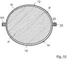 So kann beispielsweise ein erster Abschnitt der wenigstens ersten Folienhalbschale 14, beispielsweise im Bereich des ersten Flanschs 22, aus einem plastisch umformbaren, insbesondere metallhaltigen, Material M1 hergestellt sein, und ein zweiter Abschnitt, beispielsweise im Bereich des Aufnahmebereichs 18, aus einem biologisch abbaubaren und/oder durchsichtigem Material M2 hergestellt sein.For example, a first section of the at least first film half-