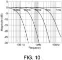 - It should be noted that the dB levels shown in all the plots and graphs presented herein are only on a relative scale and thus are not absolute characteristics of the filters and patterns being described. One skilled in the art would be able to interpret these drawings and the characteristics they describe without needing to keep to exactly to the detailed levels, times and spectral shapes.