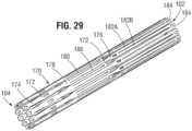 - FIG. 29 illustrates another embodiment of anouter frame 170 that can be used in combination with theinner frame 16, or any of the other frames described herein. Theframe 170 can comprise a plurality of first strut members configured as main struts or ventricular struts 172. The ventricular struts 172 can comprisefirst end portions 174 corresponding to theoutflow end 14 of the assembled valve (seeFIG. 7), and second end portions orjunctions 176 offset from the first end portions toward theinflow end 102. The ventricular struts 172 can branch at afirst junction 178 to formcurved members 180 that extend toward theinflow end 102 before doubling back toward theoutflow end 14 and connected to thejunction 178 of anadjacent strut 172 to interconnect thestruts 172. When expanded, themembers 180 can interconnect adjacent ventricular struts 172, similar to themembers 160 above. Thestruts 172 can divide or branch again at thejunctions 176 to formatrial struts 182A and 182B. Theatrial strut 182A of a givenventricular strut 172 can be coupled to theatrial strut 182B of anadjacent ventricular strut 172 to formapices 184, similar to the embodiments described above. In the illustrated configuration, theouter frame 170 does not include barbs or other tissue-engaging members, although in other embodiments the outer frame can include any number of tissue-engaging members arranged in any selected configuration.