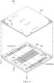 - AlthoughFIGURES 1 through 3 illustrate examples ofcovers 100, 200, 300 with an integratedthermal spreader 106, 206, 306 for a module base, various changes may be made toFIGURES 1 through 3. For example, eachcover 100, 200, 300 and its individual components can have any suitable size, shape, and dimensions. Also, components of eachcover 100, 200, 300 can be replicated or omitted as needed or desired. Further, any features shown in one or more ofFIGURES 1 through 3 can be used in others ofFIGURES 1 through 3, and any combination of features shown inFIGURES 1 through 3 can be used in an embodiment of a cover. As a specific example, the pedestals 216 andopenings 218 fromFIGURE 2 can be used in thecovers 100 and 300 ofFIGURES 1 and3. In addition, the terms "top" and "bottom" are used here to differentiate between different encapsulation layers but do not require any specific orientation of the covers during fabrication or use. "First" and "second" can also be used to refer to the different encapsulation layers, without regard to which encapsulation layer is the first encapsulation layer and which encapsulation layer is the second encapsulation layer.