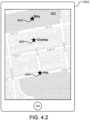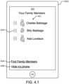 Another service to which family members are automatically given access upon being added to a family account is a device location service, provided by thedevice location server 218. As noted above, acomputing device 100 preferably includes aGPS module 135 that is enabled to determine the geographic location of thedevice 100. Referring to FIG. 4.1 a family member can access a find family members screen 400, which displays alist 401 of the family members associated with the family account. The family member can then select one or more family members for locating their respective device. In one embodiment, following selection of find family members link 404, thecomputing device 100 transmits the account IDs for the selected family members to thedevice location server 218. Thedevice location server 218 queries theuser account server 208 to confirm that the requesting user is a member of a family account including the other account IDs; this ensures that only a family member can locate other family members, thereby preserving the privacy of the family members. Following verification that the requesting user is a member of a family account including the other account IDs as family members, thedevice location server 218 returns amap 403, such as illustrated inFIG. 4.2 with thelocations 405 of each of the other family members shown thereon. Optionally, thedevice location server 218 can send an instruction to eachcomputing device 100 of the respective family members to play a sound or a tone (e.g., a ping or a ringtone) to alert the user that the device has been located. As illustrated inFIG. 4.1, each adult family member has alink 406 to prevent his or hercomputing device 100 from being located in this manner. When that option is selected, thefamily sharing module 152 transmits a message to thedevice location server 218, which sets a restriction on the account ID for that family member so that future location requests for that account ID are ignored, until such time as the family member elects to remove the restriction. After selection of thelink 406, thefamily sharing module 152 updates the link to indicate an option to unhide the user's device.