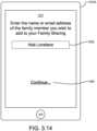 From thefamily screen 321, the family organizer may also selectlink 326 to initiate operations for adding a family member to the family account, where the family member already has an account ID with thecontent storage system 200. Following selection oflink 326, thefamily sharing module 152 displays 3.14 a screen configured to receive the name or email address infield 358 of the family member to be added to the family account, such asscreen 337 shown inFIG. 3.14. The family organizer would enter the name oremail address 358 and select the continuelink 360. In response, thefamily sharing module 152 passes the name or email address to thecontacts module 137 which searches the family organizer's contact directory on thecomputing device 100A for a match. One (or more) matching names or email address from the family member's contact directory are then presented to the family organizer (not shown) who then selects the appropriate name. Thefamily sharing module 152 transmits the selected name and/or email address to thecontent storage system 200, which provides the name and/or email address to theuser account server 208. Theaccount server 208 verifies that there is an account ID on thecontent storage system 200 that is associated with the name and/or email address.
