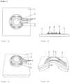 Die Krümmung der Wölbung in der erfindungsgemäßen Struktur ist vorzugsweise so stark, dass an mindestens einem Punkt an die Struktur eine Tangente so angelegt werden kann, dass sie sich auf einer gegebenen Strecke, z. B. 10 mm, um mindestens ein Zehntel dieser Strecke, also z. B. 1 mm, von der Tangente entfernt. Dieser Wert wird in der vorliegenden Erfindung als "Krümmung von mindestens 1/10" bezeichnet. In bestimmten Ausführungsformen ist die so definierte Krümmung mindestens 2/10, 5/10 oder 10/10.The curvature of the dome in the structure according to the invention is preferably so great that at least one point a tangent can be applied to the structure so that it extends along a given distance, e.g. B. 10 mm, by at least one tenth of this distance, ie z. B. 1 mm, away from the tangent. This value is referred to as "curvature of at least 1/10". In certain embodiments, the curvature so defined is at least 2/10, 5/10, or 10/10.