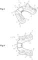 L'appareil 1 comporte deux ailettes 5 érigées sur la face supérieure 8 approximativement dans la zone entre la partie antérieure 2 et les parties latérales 3, 4. Chacune de ces ailettes 5 s'étend le long de l'arc mandibulaire sur une largeur déterminée très réduite, inférieure à environ 12 mm, et correspondant en pratique et au maximum à l'étendue de deux dents du maxillaire sur lesquelles l'ailette vient s'appliquer. Ces deux dents du maxillaire sont de préférence 13, 14 et 23, 24 selon la nomenclature classiquement utilisée et qui correspondent à des canines et des premières prémolaires. D'ailleurs, on peut voir sur les figures de l'appareil 1 que la face intérieure 9 des ailettes 5 comporte des empreintes des dents du maxillaire sur lesquelles ces ailettes 5 s'appliquent. De préférence et comme représenté, les ailettes 5 ont une base plus large qu'à leur sommet. Du fait de la forme en arc de la mandibule et du maxillaire et des formes des dents, notamment d'un retrait existant entre deux dents, ces ailettes 5 pourtant de largeur réduite, permettent un maintien efficace de la mandibule en protrusion et, ceci, avec un minimum de gène et d'encombrement en bouche.The