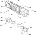 Während des Einbringens kommt der Kopf des Aktivierungselementes zu einer Stelle wo er nicht mehr einer Außenfläche gegenüberliegt, die das Aktivierungselement 200 zusammen drückt, da durch die geneigte Fläche der Kopf 204 ins Innere verstellt wurde und im Moment wo der Kopf 204 sich von der Arretierung befreit, da er dank der geneigten Fläche in Richtung der Mitte und mit der Kompressionskraft verschoben wurde, schnappt er nach vorne ein und spreizt den Kopf des Hohlkörpers 104 und klemmt den Kopf 104 unter Vermeidung auf dieser Weise einer neuen Kompression.During insertion, the head of the activator comes to a point where it no longer faces an external surface that compresses the