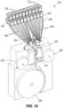 - As shown inFig. 5, themotor bases 134 defineopenings 146, or inlets, in theledge 142 that correspond to theactive canisters 122A. The motor bases 134 also include aswitch 150 adjacent eachopening 146. When acanister 122A is positioned on theledge 142, thecanister 122A communicates with theopening 146 and activates theswitch 150. Theswitch 150 indicates to themotor base 134 that a canister is currently positioned on theledge 142. The motors in themotor base 134 can then operate thecanister 122A (e.g., by rotating a disk on the bottom of thecanister 122A) to dispense pharmaceuticals into theopening 146. In some embodiments, an infrared beam may detect when pharmaceuticals pass through each of theopenings 146. The pharmaceuticals travel through themotor base 134 and are ejected through anoutlet 154 formed in a face of themotor base 134. Theoutlets 154 dispense the pharmaceuticals from themotor base 134 into thecorresponding manifold 138.