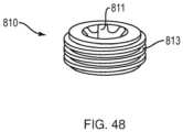 - FIG. 48 illustrates one embodiment of aset screw 810 for use with the multiple setscrew insertion instrument 800. Theset screw 810 can include a through-bore 811 formed therein with a geometry complementary to the inserter shaft distal portion 854 to allow the set screw to stack onto theinserter shaft 802 and be driven by theinserter shaft 802 when theinserter 800 is rotated. Theset screw 810 can also includethreads 813 formed on an outer surface thereof that can interface with threads formed on, e.g., an inner surface of a bone screw receiver head during insertion thereof using theinstrument 800.