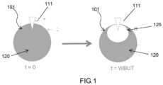 - Water breakup time is measured at room temperature as follows: lenses are picked up with soft plastic tweezers as close to the edge of the lens as possible, base curve toward the measurer, taking care that the lens does not touch the sides of the well after being removed from the saline. As illustrated schematically inFIG. 1, the lens (101) is shaken once to remove excess saline and a timer is started. Ideally, the water film (120) in the base curve surface of the lens will recede from the point of contact with the tweezers's tips (111) in a uniform, circular pattern (125). When approximately 30% of the hydrated area (125) has receded, the timer is stopped and this time is recorded as the water breakup time (WBUT). Lenses that do not display the ideal receding pattern can be placed back in the tray and remeasured, after rehydrating for at least 30 seconds.