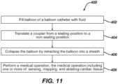 - FIG. 11 is a method flow chart for amethod 400 for performing a medical operation, in accordance with the disclosed technology.Method 400 can include filling a balloon of a balloon catheter with fluid (step 402) causing a fluid to evacuate through an irrigation port of a balloon catheter. Themethod 400 can include translating a coupler from a sealing position to a non-sealing position (step 404) permitting fluid to evacuate from the balloon. Themethod 400 can include and collapsing the balloon by retracting the balloon into a sheath (step 406).