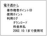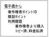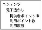コンテンツ管理部22は、コンテンツの付加情報をもとにコンテンツに対する料金を管理する。コンテンツの付加情報とは、著作権者名、提供者ポイント蓄積部10のID、利用料金、利用履歴、利用条件などである。ここで、著作権者名はコンテンツ提供者名と同じであっても構わない。これらのコンテンツの付加情報は、例えば、コンテンツのヘッダファイルやコンテンツに埋め込まれた電子透かしとしてコンテンツに付加される。図2は、コンテンツに埋め込まれた電子透かしの一例を示す。ここで、提供者ポイントIDとは、当該コンテンツ提供者が所有する提供者ポイント蓄積部10のIDである。利用ポイント数とは、例えば、コンテンツの複製に必要なプリペイドポイント数である。利用履歴とは、コンテンツがダウンロードされた日時、複製された日時等である。