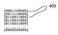 テキストバッファ137は、テキストデータを変換部143へ提供する。次いで、変換部143は、テキストデータのフォントを検出し、テキストデータに対応するフォントマップを辞書141から取得する。この情報を用いて、変換部143は、テキストデータに対応するバイナリピクセルデータを生成する。より詳細には、図4Aおよび4Bに示すように、特定されたフォントの文字「A」のピクセルマップを、バイナリ画像データの列に変換することができる。ピクセルマップ401中のピクセルの各々の列は、画像データのバイナリのライン403に変換され、ここで、それぞれの「空」または「白」のビットが画像データの対応ライン403のバイナリ数「0」に対応し、および、それぞれの「濃」または「暗」が画像データの対応ライン403のバイナリ数「1」に対応する。同様に、画像情報が蓄積され、グラフバッファ139は、変換部143に提供され、バイナリ画像データの列に変換される。図示された本発明の例は、テキストデータまたは画像情報のピクセルの値を示すために1ビットのみを採用しているが、本発明の別の実施形態は、ピクセルの値を示すためにいくつかの数のビットを採用することができることに留意されたい。このように、映写ディスプレー101は、以下で説明するように、グレーまたはカラーで画像を映写することができる。  The