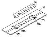 図5は、本発明の接続構造を誘電体導波管フィルタに利用する例の斜視図を示す。プリント基板53に入出力用の2つのモード変換部57a、57bを形成し、それぞれにスロット58a、58bを形成する。入出力マイクロストリップに接続されたモード変換部の導体膜は接続された構造となっているが、導体壁によってモード変換部57a、57b内のエネルギーは誘電体導波管フィルタ50あるいはマイクロストリップとしか結合しないので問題はなく、導体膜を形成された誘電体導波管フィルタを固定するために利用する。