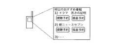 例えば、図4に示すような視聴履歴が得られた場合でも、ニュースのコンテンツとそれ以外のコンテンツに分類した場合には、図16に示すように分類できたとする。図16の例では、ニュース番組(図16(a))とニュース番組以外の番組(図16(b))に分類し、それぞれについて別個に偏りが解析された結果、それぞれ異なる視聴時間帯に偏っていると分析される。このような場合には、図17に示すように各コンテンツに応じて情報を提供するタイミングを個別に設定することが望ましい。図17のフローチャートでは、視聴コンテンツ(の種類)で分類できる場合には(ステップ2707)、視聴コンテンツ(の種類)で分類したうえで(ステップ2708)、図3のフローチャートに示されるような視聴時刻と視聴場所に基づく配信タイミングの決定を行っている(ステップ2701〜2706)。例えば、朝、ニュースを見る習慣があることが視聴履歴から判断できたときには、図18に示すように、ニュースの内容をあらかじめ提示する。これにより、ユーザは、これからの放送されるニュースの概要をあらかじめ確認することが可能になる。また、ドラマ等の番組の場合には、前回までのあらすじに関する情報を提示したり、今回のドラマのあらすじに関する情報を提示することが可能になる。  For example, even when the viewing history as shown in FIG. 4 is obtained, if the content is classified into news content and other content, it is assumed that the content can be classified as shown in FIG. In the example of FIG. 16, news programs (FIG. 16 (a)) and programs other than news programs (FIG. 16 (b)) are classified, and the bias is separately analyzed for each. Is analyzed. In such a case, as shown in FIG. 17, it is desirable to individually set the timing for providing information according to each content. In the flowchart of FIG. 17, if the content can be classified by the viewing content (type) (step 2707), the content is classified by the viewing content (type) (step 2708), and the viewing time as shown in the flowchart of FIG. And the distribution timing is determined based on the viewing location (