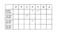 次に、情報配信タイミング決定部3506は、図31に示されるように抽出された購入品において、購入日時に偏りがないかを判断する(図29のステップ3702)。図31に示された日時の情報をもとに、購入した曜日と時間の関係を示すと、図32に示される表の通りになる。図32に示される表では、例えば、火曜日の12時から16時の間に購入した商品が2つあることを示している。このような表で表現した結果、購入日時に関しては偏りがないことがわかる。そこで、この例では、図29のステップ3704へ進む。もし、購入日時に偏りがあった場合には(図29のステップ3702でYes)、その時間帯が「日用品」を購入する可能性が高いと判断し、その時間帯の前にメール等で日用品に関する特売情報を送信するように設定する。  Next, the information distribution