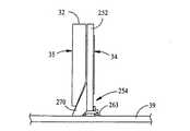 替わりに、PCBにはんだ付けされるように適応される垂直実装インターコネクトエクステンダが用いられるかもしれない。図16Aから16Eを参照すると、パワーコンバータ32を支持する垂直インターコネクトエクステンダ254が示されている。図16Cを参照すると、エクステンダ254は、開口部255を備えたPCB252を含み、開口部255は図3A、3Bで示したもののような「スルーボード」実装配置におけるパワーコンバータ32の下側位置に対応する。コンバータ32の底面34は図16A及び16Dのインターコネクトエクステンダ254を通って伸びているのが示されている。図15のエクステンダ253と同様のPCB252を、インターコネクトエクステンダ254で用いられるかもしれないが、カード・エッジコネクタと結合する代わりに、垂直実装エクステンダ254が、回路基板39への表面実装アセンブリに対して形成される、例えばNAS/インタープレックス社の「2段相互接続」などの(図16Eでより詳細に示した)リード線263を含むということは除かれる。PCB252は導電経路(図示せず)を含み、パワーコンバータ上のインタフェース接点をリード線263に接続する。リード線263ははんだ付けされ、回路基板39への次のはんだ付けの間、安定のために回路基板252に接着されるかもしれない。熱伝導ガセット板270が設けられて機械的安定性を増し、エクステンダと回路基板39との間の熱抵抗を減じるかもしれない。ガセット板270はエクステンダ254の回路基板252へ機械的に取り付けられ(またははんだ付け及び接着されて)、回路基板39上のパッド(例えば、図16Eのパッド271)にはんだ付けされるかもしれない。ガセット板270及びリード線263は、図10−11に関連して上記で検討した技術と同様に、コンバータ32からかつ回路基板39へ熱が伝導するのを助ける。ヒートシンクは、エクステンダ254、パワーコンバータ32の1つ以上の面、または上記で検討したような回路基板39へ追加されるかもしれない。スプリングクリップ(図示せず)または接着剤が加えられ、パワーコンバータ32は上記で説明したインターコネクトエクステンダへしっかりと取り付けられてはんだ付け処理の間機械的な安定が設けられるかもしれない。垂直エクステンダを回路基板39へ取り付ける為に用いられるはんだ付けの融点より高い融点を備えたはんだ付けが、パワーコンバータ32、リード線263、及びガセット板270を回路基板252に取り付けるために用いられて、後のはんだ付け処理の間の問題を回避するかもしれない。ガセット板もピンや指状突起などの特徴が与えられ、それらは回路基板39またはPCB252へ取り付けられて組み立てやはんだ付け処理の間すべるのを防ぐかもしれない。  Alternatively, a vertical mount interconnect extender adapted to be soldered to a PCB may be used. Referring to FIGS. 16A through 16E, a