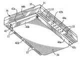 図3A及び3Bは、それぞれ、パワーコンバータ装置30の分解断面図及び断面斜視図を示す。装置はパワーコンバータ32及び回路基板アセンブリ39を含む。下方から見たパワーコンバータ32の斜視図が図4A及び4Bに示される。図3及び4を参照すると、パワーコンバータは概して直方体の形を持つ上側部分36及び下側部分31を含む。上側部分は概して長方形の上面35及び突出面42を有する。下側部分は概して長方形の底面34を有する。下側部分31の側面(例えば、側面46a、46b)は上側部分36の側面(例えば、側面44a、44b)より長さが短く、上側部分36が下側部分31の上にかかることを可能にし突出面42を露出させる。下側部分は、図4A及び4Bに示されたように上側部分の中央にあって突出面42上に左右対称の突出部領域(例えば、対称領域42a、42b、42c、42d)を構築する。パワーコンバータへの電力及び信号の入力−出力接点接続は、突出面42上に領域42a−dに沿って形成されるインタフェース接点33(例えば、ボールグリッド・アレー(「BGA」)またはランドグリッド・アレー(「LGA」)などのはんだ付けが可能な接点)経由で成されるかもしれない。インタフェース接点33は全周囲(例えば、図4Aに示される領域42a−d)または周囲の一部(例えば、図4Bに示されるような2つの長い領域42b、42d)に沿って配置されるかもしれない。  3A and 3B show an exploded sectional view and a sectional perspective view of the power converter device 30, respectively. The device includes a