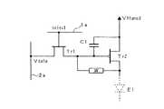 図1における制御用TFT(Tr1)のゲートに走査ライン1aを介してオン制御電圧(Select)が供給されると、制御用TFT(Tr1)はソースに供給されるデータライン2aからのデータ電圧(Vdata)に対応した電流を、ソースからドレインに流す。したがって、制御用TFT(Tr1)のゲートがオン電圧の期間に、前記コンデンサC1 が充電され、その電圧が駆動用TFT(Tr2)のゲートに供給される。それ故、駆動用TFT(Tr2)は、そのゲート電圧とソース電圧に基づいた電流をEL素子E1 に流し、EL素子を発光駆動させる。