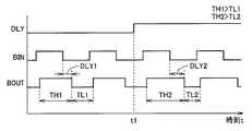 そのため、バッファ回路10bは、時刻t2以降において、インバータ21内のNチャネルMOSトランジスタ23,28側のドライブ能力がPチャネルMOSトランジスタ22,27側のドライブ能力より大きくなる。すなわち、インバータ21における入力バッファ信号BINの遅延量は、LレベルからHレベルに遷移する時よりもHレベルからLレベルに遷移する時の方が大きくなる。したがって、出力バッファ信号BOUTは、図5に示すように、時刻t2以降において、Hレベルの期間TH2の方がLレベルの期間TL2より長くなる。