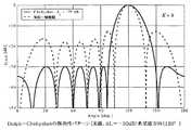 横軸は到来角、縦軸は指向性利得である。比較例として、アレーアンテナとしては一般的なものである、等相一様励振振幅分布の指向性利得を破線で示している。このドルフ−チェビシェフ・アレーアンテナでは、希望波方向(120°)にメインローブを向け、全てのサイドローブレベルは所定値以下に抑えている。