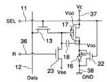 ノード電位が安定した後、書き込み準備信号Rが非能動状態(“L”レベル)になることによって、リセットトランジスタ23、導通トランジスタ22およびバイアストランジスタ21が非導通となる。これによって保持キャパシタ18の第2電極はGND電位に設定され、有機EL素子16は非発光状態となる。この状態は、電源VELがハイインピーダンス状態の間保持される。即ち、書き込み準備信号Rと走査信号SELとの入力タイミングに時間差があっても前記の状態は保持され、有機EL素子16は発光しない。次に走査信号が画素選択スイッチ13のゲート電極に与えられて映像信号電圧が供給されると、これにより駆動トランジスタ17のゲート電極およびキックキャパシタ20間のノード電位VG2が、閾値電圧Vthを映像信号電圧に加えたレベルとなる。次に前記走査信号SELが非選択状態になり画素選択スイッチ13が非導通になってから電源VELが供給され、Vth補償された所定の駆動電流が電源VELから駆動トランジスタ17を介して有機EL素子16に流れる。ここで、実施例1で説明したように駆動トランジスタ17のソース電位は有機EL素子の電極間電位の上昇に応じて上昇しソースフォロア様の状態になるが、保持キャパシタ18によって駆動トランジスタのソースおよびゲート電極間の電位は保持される。これにより駆動電流は所定電圧Veeと映像信号電圧との電位差により決定されることになり、駆動トランジスタ17の閾値電圧Vthにバラツキがあっても、駆動電流は影響されなくなる。After the node potential is stabilized, the write preparation signal R becomes inactive (“L” level), whereby the