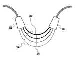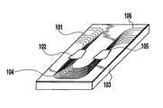 図2に図1のアレイ導波路部分のコア幅がわかるように強調した上面図を示す。図2に示すように、そのアレイ導波路104のコア幅が内側(短いアレイ導波路側)から外側(長いアレイ導波路側)に向けて徐々に細くなるよう設計している。ここで、202は最も内側のコア幅8.2ミクロンのアレイ導波路、201は最も外側のコア幅5.8ミクロンのアレイ導波路を示す。  FIG. 2 shows a top view emphasized so that the core width of the arrayed waveguide portion of FIG. 1 can be understood. As shown in FIG. 2, the core width of the arrayed