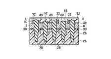 (f)次に、層間絶縁膜として第五の絶縁膜52を全面に積層し、CMP技術や化学的ドライエッチング(CDE)技術を用いて平坦化し、第六の絶縁膜54を全面に積層する。その後、リソグラフィ技術とエッチング技術を用いて、第一のコンタクト溝56と第二のコンタクト溝58を形成し、図33乃至図36に示す構造を形成する。(F) Next, a fifth insulating