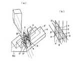 ここで、複数のフレネル凹面鏡又はフレネル凸レンズが相互に偏心して同一基板上に重畳して設けられている場合に、その一点近傍に入射した光束はそれぞれのフレネル凹面鏡又はフレネル凸レンズにより反射作用あるいは屈折作用を同時に受けて異なる複数の方向へ別れて進むことを説明する。図3は、フレネル凹面鏡又はフレネル凸レンズを構成する基板50の表面にバイト51を用いて第1のフレネル凹面鏡又はフレネル凸レンズの作用面Aと非作用面A’とからなる溝(畝)をミクロには略平行に刻んでいく様子を示している。通常、フレネル凹面鏡やフレネル凸レンズの作用面Aは基板50の表面に対して比較的大きく傾斜しており、非作用面A’は基板50の表面に対して略垂直に形成される。図4は、第1のフレネル凹面鏡又はフレネル凸レンズの溝(畝)を刻んだ後に、第2のフレネル凹面鏡又はフレネル凸レンズの作用面Bと非作用面B’とからなる溝(畝)をミクロには略平行に刻んでいく様子を示している。この第1のフレネル凹面鏡又はフレネル凸レンズの溝(畝)と第2のフレネル凹面鏡又はフレネル凸レンズの溝(畝)とは、図4に示すようにほとんどの領域で交差している。第2のフレネル凹面鏡又はフレネル凸レンズの溝(畝)を複数刻むと、図5(a)に示すように、4つの面A、B、A’、B’で囲まれる四角錐の集合が基板50の表面に並列に形成される。その平面図を図5(b)に示す。非作用面A’、非作用面B’は光束の入射側から見ると、線に見えるので、第1のフレネル凹面鏡又はフレネル凸レンズの作用面Aと第2のフレネル凹面鏡又はフレネル凸レンズの作用面Bとが図示のように2次元方向へ交互に密に並んでいるものとなるため、基板の一点(厳密には、ある程度の面積を有する領域)に入射した光束は、面積分割により、作用面Aに入射した成分は第1のフレネル凹面鏡又はフレネル凸レンズの作用を受け、作用面Bに入射した成分は第2のフレネル凹面鏡又はフレネル凸レンズの作用を受けるので、結果的に、第1のフレネル凹面鏡又はフレネル凸レンズによる反射作用あるいは屈折作用と第2のフレネル凹面鏡又はフレネル凸レンズによる反射作用あるいは屈折作用とを同時に受けて異なる2つの方向へ別れて進むことになり、図1、図2で説明したように、投影光学系11の瞳(入射瞳13)から投影スクリーン1の各点近傍に入射した光束は、2つのフレネル凹面鏡2L、2Rにより同時に異なる方向に反射され、それぞれ射出瞳20L、20Rに別れて略同じ光量で入射することになり、略同じ明るさの投影像が同時に観察可能になる。なお、以上の説明は2つのフレネル凹面鏡又はフレネル凸レンズが相互に偏心して同一基板上に重畳して設けられている場合であったが、3つ以上の場合でも同様に説明できる。  Here, in the case where a plurality of Fresnel concave mirrors or Fresnel convex lenses are arranged eccentrically and superimposed on the same substrate, the light beam incident near one point is reflected or refracted by each Fresnel concave mirror or Fresnel convex lens. We will explain that we will be separated and proceed in different directions at the same time. FIG. 3 shows a groove (を) formed by the working surface A and the non-working surface A ′ of the first Fresnel concave mirror or Fresnel convex lens using a
