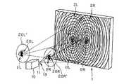 図2では、フレネル凹面鏡2Lと2Rはそれぞれの中心OL、ORが相互に偏心した凹面鏡として図示してあるが、実際には、同一基板に円錐輪帯状の反射面をそれぞれ中心OL、ORに同心に連結してなる平面状のもので、後で説明するするように、2つのフレネル凹面鏡2Lと2Rは同一面上に同時に重畳して存在し、投影光学系11の瞳を入射瞳13としてその入射瞳13から投影スクリーン1の一点近傍に入射した光束は、2つのフレネル凹面鏡2L、2Rにより同時に異なる方向に反射され、それぞれ射出瞳20L、20Rに別れて入射する。  In FIG. 2, the Fresnel