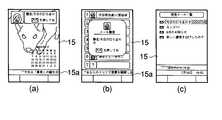 また、図5の(a)に示す待受画面において、グループ設定した中の友人から電子メールを受信すると、図6の(a)に示すようにメール受信を知らせる。また、図5の(b)に示す待受画面において、グループ設定した中の友人から電子メールを受信すると、図6の(b)に示すようにメール受信を知らせる。このような表示を行っている状態でiモード(登録商標)のメール閲覧機能を選択することで、ディスプレイ15の表示画面は図6の(c)に示すような受信メールの一覧表示に切替わる。 In addition, when an e-mail is received from a group-set friend on the standby screen shown in FIG. 5A, the reception of the mail is notified as shown in FIG. 6A. In addition, when an e-mail is received from a group-set friend on the standby screen shown in FIG. 5B, the mail reception is notified as shown in FIG. 6B. By selecting the i-mode (registered trademark) mail browsing function in such a display state, the display screen of the