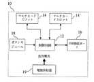 図1は、本発明のマルチカードデータアンロード装置のハードウェア構造のブロック概念図であり、マルチカードデータアンロード装置10には、全体装置の作動流れを制御する、二つのマルチカードスロット14、14�が電気的に接続される、 制御回路12と、USB接続ポート16と、ボタンモジュール18と、があり、二つのマルチカードスロット14、14�により、二つのメモリーカードが挿接され、当該二つのメモリーカードは、異なる規格のメモリーカードであり、規格として、SDカード(Secured Digital、SD)や、マルチメディアカード(Multimedia Card、MMC)、SMカード(Smart Media、SM)、MSカード(Memory Stick)、CFカード(Compact Flash、CF)、PCMCIAメモリーカード或いはXD Pictureメモリーカード等が挙げられ、USB接続ポート16に、USB記憶装置が挿接されることにより、メモリーカードとUSB記憶装置とは、電気的に接続されて、データの交換ができ、ボタンモジュール18には、ユーザ操作インターフェースがあり、また、上記の各ユニットが作動することに必要とする電力を提供する電源供給器19がある。 FIG. 1 is a block conceptual diagram of the hardware structure of a multi-card data unloading apparatus according to the present invention. The multi-card