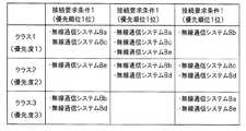 また、優先順位が2位の接続要求条件であるサービスエリアの基準にしたがい、無線通信システム8a,8d,8e,8hがクラス1に、無線通信システム8c,8fがクラス2に、無線通信システム8b,8gがクラス3に分類される。このクラス分類の基準は、例えば、クラス1はサービスエリアが人口カバー率90%以上の無線通信システム、クラス2はサービスエリアが人口カバー率70%の無線通信システム、クラス3はサービスエリアが人口カバー率50%の無線通信システムという基準である。また、この例では無線通信システム8を3つのクラスに分類したが、必ずしも3つのクラスである必要はなく、さらに多くの或いはさらに少ないクラスに分類してもよい。 Further, according to the service area standard, which is the connection request condition with the second highest priority, the