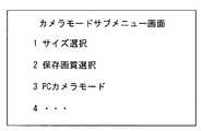 図7はステップS11におけるカメラモードサブメニュー処理手順を示すフローチャートである。まず、カメラモードサブメニュー画面を表示し、使用者がキー操作部7を操作することによってサブメニューが選択されるのを待つ(ステップS21)。図8はカメラモードサブメニュー画面を示す図である。本実施形態のサブメニュー画面では、撮影画像のサイズを選択する「サイズ選択」、保存する画像の画質を選択する「保存画質選択」、PCに画像データを伝送する「PCカメラモード」等が選択可能である。ここで、携帯電話装置のカメラをPC用のウェブカメラ(PCカメラ)として使用する場合、PCカメラモードを選択する必要がある。また、携帯電話装置100をPC200に接続し、インターネット500を介してTV電話のように通信を行う場合、携帯電話装置100のカメラで撮影した動画像データだけでなく、音声データを外部I/F部20を介してPC200に伝送できるようにする必要がある。  FIG. 7 is a flowchart showing the camera mode submenu processing procedure in step S11. First, the camera mode submenu screen is displayed, and the user waits for the submenu to be selected by operating the key operation unit 7 (step S21). FIG. 8 is a diagram showing a camera mode submenu screen. On the submenu screen of this embodiment, “size selection” for selecting the size of the captured image, “storage image quality selection” for selecting the image quality of the image to be stored, “PC camera mode” for transmitting the image data to the PC, and the like are selected. Is possible. Here, when the camera of the mobile phone device is used as a web camera (PC camera) for PC, it is necessary to select the PC camera mode. Further, when the