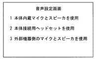 次いで、使用者がキー操作部7を操作することにより、音声設定が選択されたか否かを判別する(ステップS24)。音声設定が選択された場合、音声設定画面を表示する(ステップS25)。図10は音声設定画面を示す図である。本実施形態の音声設定画面では、携帯電話装置100の本体内蔵のマイク9及びスピーカ10を使用する設定項目である「本体内蔵マイクとスピーカを使用」、携帯電話装置用の外付けヘッドセット(マイク付きヘッドホン)を使用する設定項目である「本体接続用ヘッドセットを使用」、及びPC200側のマイク202及びスピーカ203を使用する設定項目である「外部機器側のマイクとスピーカを使用」の3つが表示され、任意の項目に設定可能である。  Next, it is determined whether or not the voice setting has been selected by operating the
