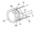 このように組み付けた状態で各牽引具25の何れか一方を、前記内視鏡操作部方向に牽引すると、チャンネル固定部22が、溝21aに沿ってキャップ部21の周方向に移動するので、これに伴って開口部4aがキャップ部21の軸線回りに回転する。このとき、固定部本体28の先端面とキャップ部21の先端面との相対位置は、略同一となっているか、あるいは固定部本体28がやや先端側に突出した状態となっている。As shown in FIG. 7, the