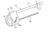 また、請求項2に記載の内視鏡用外付けチャンネルにおいて、前記キャップ部に、前記軸線回りに沿った溝を設けるとともに、前記固定部本体に、前記溝に係合する係合部を設けた内視鏡用外付けチャンネルを採用しても良い。この場合、前記固定部本体の、前記軸線回りの回動動作を、該固定部本体に接続された第2の牽引具を介して行う内視鏡用外付けチャンネルを採用しても良い。 The endoscope external channel according to claim 2, wherein a groove along the axis is provided in the cap part, and an engaging part that engages with the groove is provided in the fixing part main body. Alternatively, an endoscope external channel may be employed. In this case, an endoscope external channel may be employed in which the rotation operation of the fixed portion body around the axis is performed via a second traction tool connected to the fixed portion body.