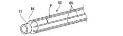 第6実施形態と第1実施形態との異なる点は、第1実施形態ではチャンネルチューブ11の周囲に網状体の管路補強材15を被覆したのに対し、第6実施形態の外付けチャンネル60では、図8に示すように、チャンネルチューブ11の周囲に複数の棒状の管路補強材65を被覆した点である。すなわち、本実施形態では、チャンネルチューブ11の周囲にその軸方向に沿って金属製の棒状管路補強材65を複数配設している。各管路補強材65のピッチPは、使用する処置具の外径より小さく設定されるが、最小ピッチとして1mmに設定すれば通常の処置具の突き抜けを防ぐことができる。 The difference between the sixth embodiment and the first embodiment is that, in the first embodiment, the