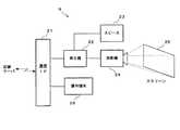 図2は、上映装置9の具体的構成の一例を示したブロック図である。21は店舗サーバ6との間で通信を行うための通信インターフェイス、22は店舗サーバ6から送信されてきたコンテンツ(映像・音声データ)を再生する再生機、23は再生機22で再生された音声を出力するスピーカ、24は再生機22で再生された映像をスクリーン25に投射する投影機(プロジェクタ)である。スピーカ23や投影機24としては、ホームシアターで用いられる機器を使用してもよい。スクリーン25は大型のスクリーンであって、カラオケルームの壁に設けられている。スクリーン25の前にはソファやテーブル(図示省略)が設置されており、利用者はソファに座ってスクリーン25に映し出される映画を鑑賞する。カラオケルームは完全な個室であるから、利用者は貸切の映画館の気分で、誰にも邪魔されずに好きな映画を存分に楽しむことができる。なお、ここでは投影機24によって映像をスクリーン25に映し出すようにしているが、大型のプラズマディスプレイなどを利用して映像を映し出すようにしてもよい。26はユーザが操作する操作端末であって、例えば、メニュー等の項目を表示するモニタ装置と、このモニタ装置に表示される項目を選択するためのリモコンとから構成される。 FIG. 2 is a block diagram showing an example of a specific configuration of the