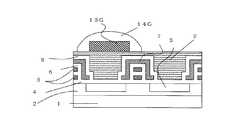 (6)その後、例えばアクリル系熱硬化型透明樹脂の薄膜を塗布、熱硬化するか、またはHMDS(ヘキサメチルジシラザン)膜の蒸気塗布後、緑色光用第1のカラーフィルタ層13Gを形成するためのレジストを塗布する。このレジストには、染料あるいは顔料が、例えば緑色系波長の光を選択的に透過するように調合されている。