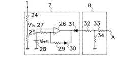 図2に示す入力電圧検出回路(7)の変更例として図7に示す入力電圧検出回路(7)は、入力側基準電圧Vref1を発生する基準電源(28)と、直列に接続され直流電源(1)からの入力電圧Vinを検出する2つの分圧抵抗(24,25)と、分圧抵抗(24,25)の間に接続された反転入力端子及び基準電源(28)に接続された非反転入力端子を有するオペアンプ(53)と、オペアンプ(53)の出力端子に接続されたカソードを有する整流ダイオード(31)と、オペアンプ(53)の出力端子と反転入力端子との間に接続された帰還抵抗(52)とを備える。整流ダイオード(31)のアノードは、図2の入力電圧検出回路(7)と同様に、周波数変更回路(8)に構成される第1及び第2の周波数変更抵抗(32,33)の一端に接続される。As an example of a modification of the input voltage detection circuit (7) shown in FIG. 2, an input voltage detection circuit (7) shown in FIG. 7 is connected in series with a reference power supply (28) that generates an input side reference voltageVref1 , and is connected to a DC power supply. (1) detection two dividing resistors input voltage Vin from (24, 25), are connected to connected the inverting input terminal and the reference power source (28) between the voltage dividing resistors (24, 25) An operational amplifier (53) having a non-inverting input terminal, a rectifier diode (31) having a cathode connected to the output terminal of the operational amplifier (53), and connected between the output terminal and the inverting input terminal of the operational amplifier (53). Feedback resistor (52). Like the input voltage detection circuit (7) in FIG. 2, the anode of the rectifier diode (31) is connected to one end of the first and second frequency change resistors (32, 33) included in the frequency change circuit (8). Connected.