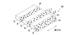 以下に本発明を、図面を参照しながら説明する。図1は、本発明の高分子フィルム(M)の概念図であり、ポリマーマトリクス(P)中に金属微粒子(m)が分散している。また本発明の高分子フィルム(M)は金属微粒子(m)の分散部分(a)と非分散部分(b)を有する。分散部分(a)は同じ方向に繰り返し配列して、縞状構造を形成している。分散部分(a)の配列方向が縦方向である。 The present invention will be described below with reference to the drawings. FIG. 1 is a conceptual diagram of the polymer film (M) of the present invention, in which metal fine particles (m) are dispersed in a polymer matrix (P). The polymer film (M) of the present invention has a dispersed part (a) and a non-dispersed part (b) of the metal fine particles (m). The dispersed portions (a) are repeatedly arranged in the same direction to form a striped structure. The arrangement direction of the dispersed portions (a) is the vertical direction.