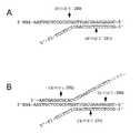 モノヌクレオチドは、1つのモノヌクレオチドのペントース環の5'リン酸がホスホジエステル結合を介して1つの方向でその隣のヌクレオチドの3'酸素に結合するような様式でオリゴヌクレオチドを生成するように反応するので、オリゴヌクレオチドの1つの末端は、その5'リン酸がモノヌクレオチドのペントース環の3'酸素に結合していない場合に、「5'末端」と呼ばれ、そしてその3'酸素が次のモノヌクレオチドペントース環の5'リン酸に結合していない場合に「3'末端」と呼ばれる。本明細書中で使用される場合、核酸配列は、より大きなオリゴヌクレオチドに対して内部である場合においてさえ、5'末端および3'末端を有するといわれ得る。核酸鎖に沿った第1の領域は、核酸の鎖に沿って5'から3'の方向に進んだときに第1の領域の3'末端が第2の領域の5'末端の前にある場合に、別の領域の上流であるといわれる。 A mononucleotide is reacted to form an oligonucleotide in such a way that the 5 'phosphate of the pentose ring of one mononucleotide is linked via the phosphodiester bond to the 3' oxygen of the next nucleotide in one direction. Thus, one end of the oligonucleotide is referred to as the "5 'end" if its 5' phosphate is not attached to the 3 'oxygen of the pentose ring of the mononucleotide, and the 3' oxygen is When it is not linked to the 5 'phosphate of the mononucleotide pentose ring of As used herein, a nucleic acid sequence may be said to have a 5 'end and a 3' end, even when internal to a larger oligonucleotide. The first region along the nucleic acid strand is such that the 3 'end of the first region precedes the 5' end of the second region as it travels in the 5 'to 3' direction along the nucleic acid strand In some cases, it is said to be upstream of another area.