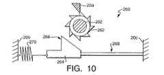 本発明に従って構成されたディスペンサー240の更なる模範的な実施形態が、図10〜12に示される。ディスペンサー240は歯車262を含み、歯車262は、親ねじ202に取り付けられ、また、装置ハウジングの第1固定部材20aに接触して、歯車262及び親ねじ202の第2方向(図10〜12において反時計回り方向)への回転を防止するように配置された半径方向に突出する複数の歯を含む。スライド264は、第2固定部材20bと第3固定部材20cとの間の歯車262近傍で直線運動するように配置される。スライド264は、歯車262の歯と係合するためのフィンガー266を含み、該フィンガー266及び歯262は、図12に示されるような歯車262を通り越すスライド264の第2固定部材20bへ向かう直線運動が、歯車262を第1方向(図10〜12において時計回り方向)に回転させるように適合される。フィンガー266及び歯車262の歯はまた、図11に示されるような歯車を通り越すスライド264の第3固定部材20cに向かう直線運動が、歯車を回転させないように適合される(すなわち、スライド264が歯車262を過ぎて第3固定部材20cに向かう際、フィンガーと歯が互いに接して滑るように構成される)。  A further exemplary embodiment of a
